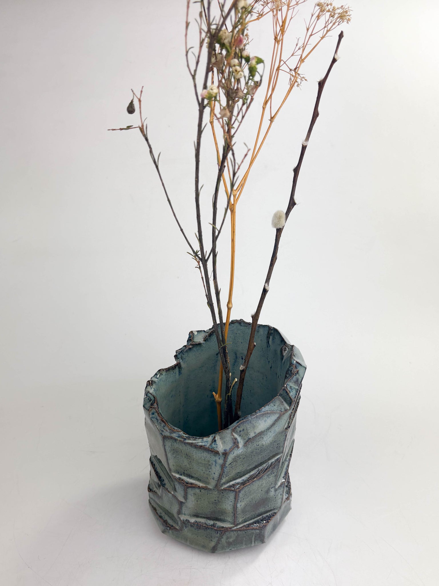 Carved from toasted stoneware clay in Blue Rutile and suitable for both dried and fresh flowers