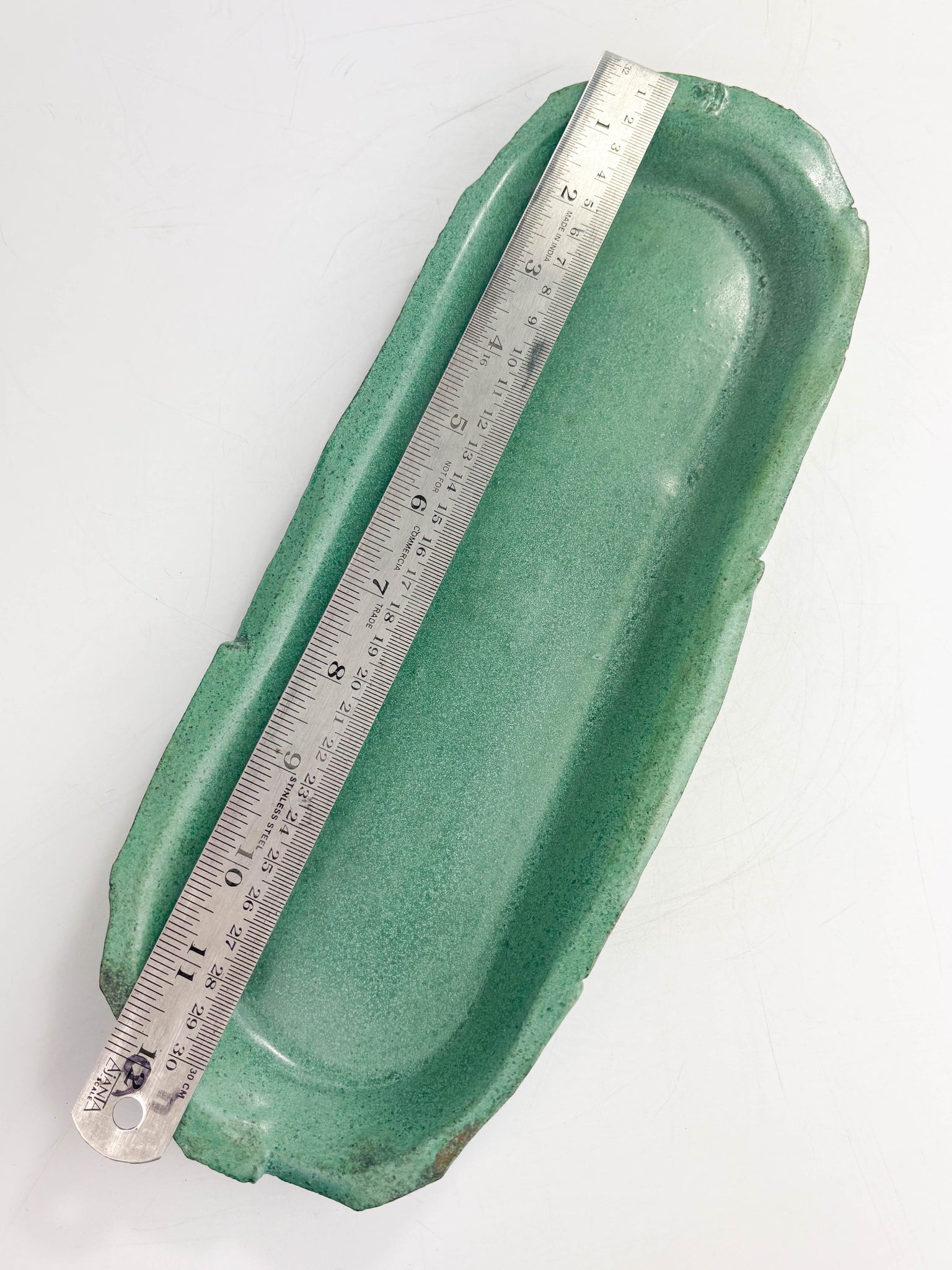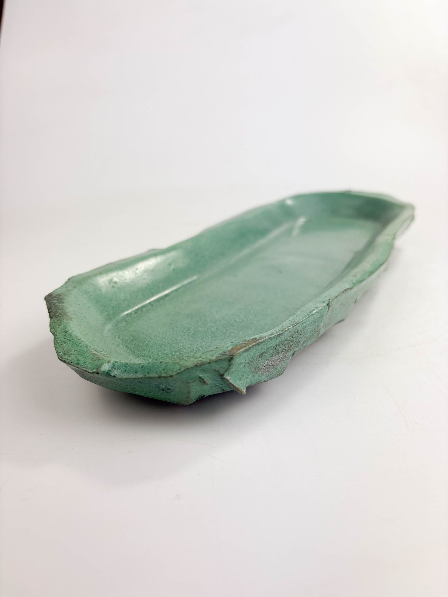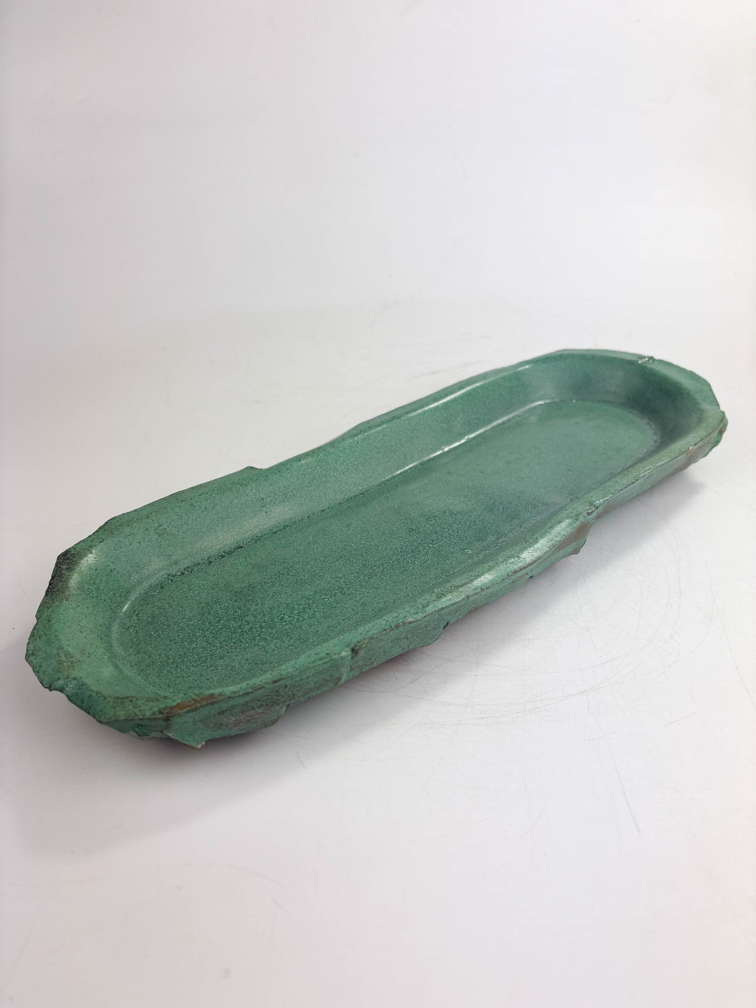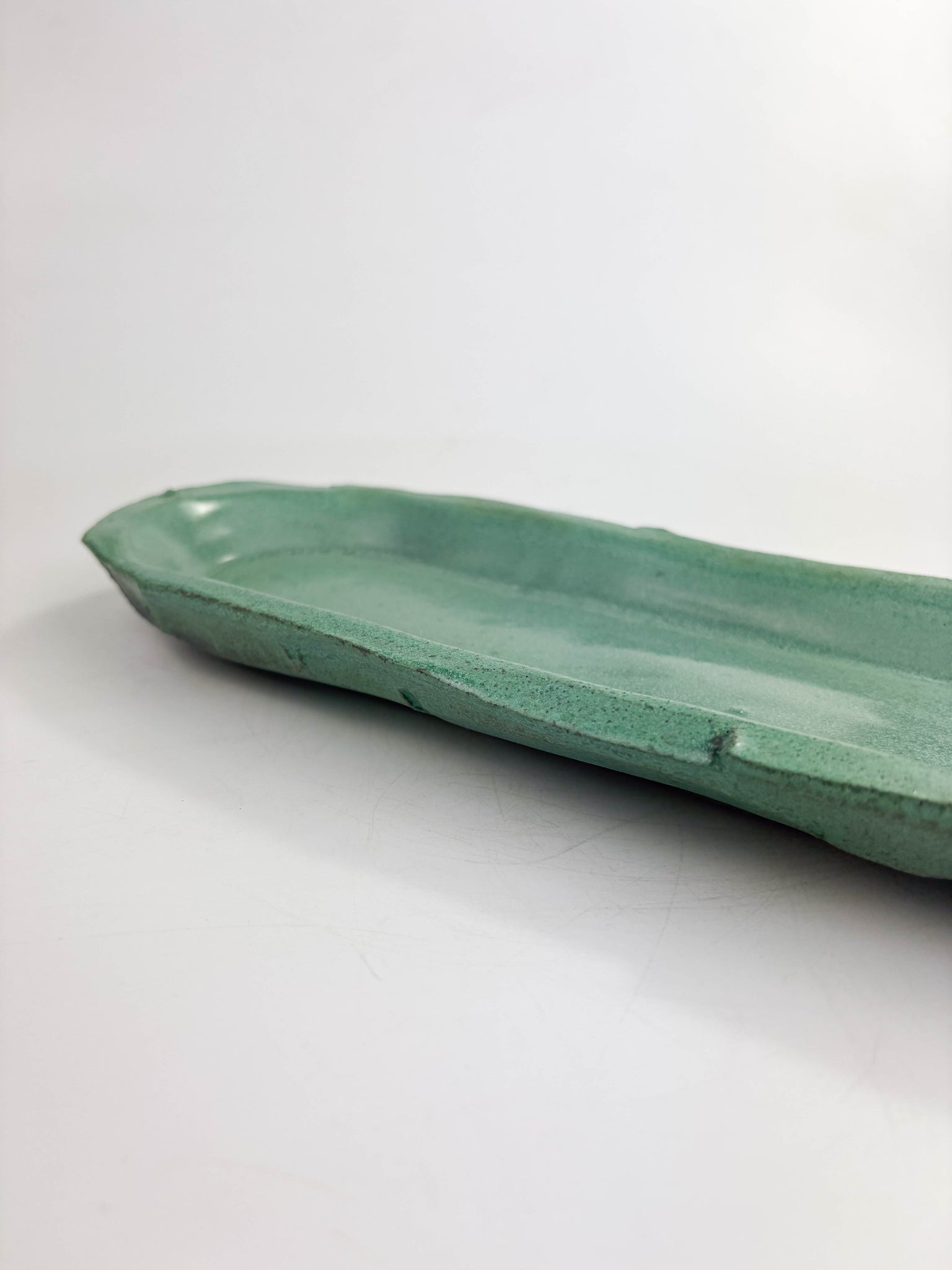 Using a former and Kurinuki techniques, this beautiful decorative tray is chunky and hand carved and glazed in Copper Oxide